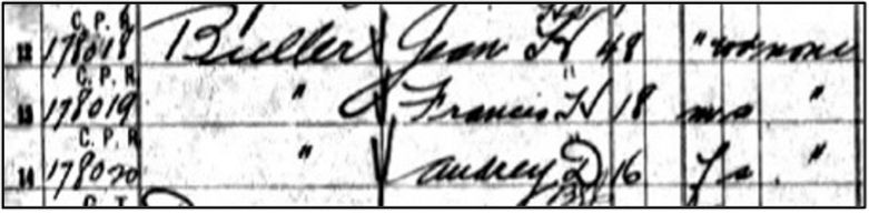 Jean Buller, Master Frances, Miss A., Miss G.A. French, September 2, 1910, Arriving Montreal, Quebec, Departing Liverpool England, Allan Line, Ship Victorian
